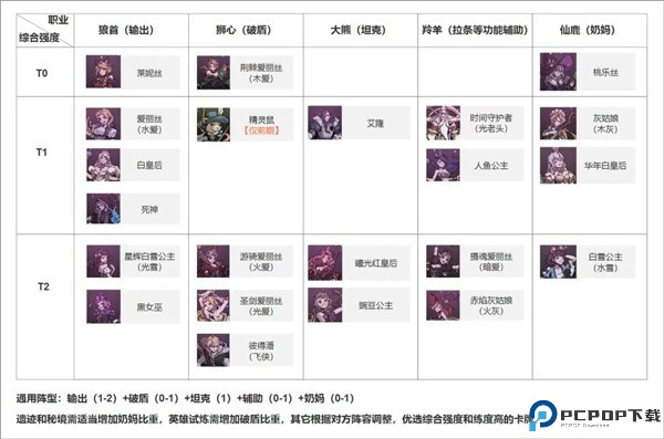 T0:技能强度明显超过其它档位,当前版本无脑养就行。T1:技能强度较强,根据情况选用补充主队,各有特色。T2:作为T0和T1的低位替代,本身技能尚可,但都存在一些或多或少问题。接下来针对T0和T1简单解释下玩法建议。莱妮丝输出之神,弱点是太脆,需要有嘲讽坦克协助,回合越长,输出越高。