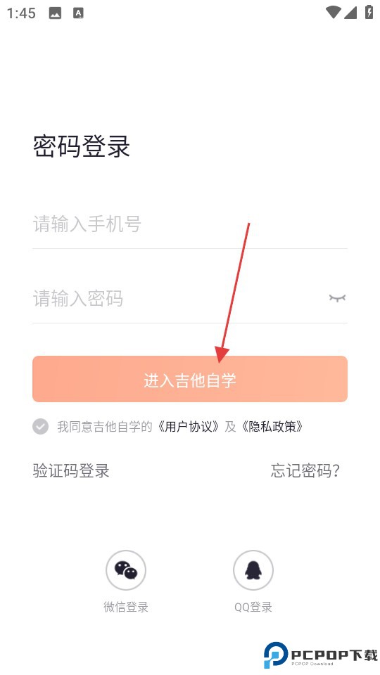 2、进入APP的登录界面在对应输入框中准确录入您的手机号码,仔细填入设置好的密码,确认信息无误后点击进入吉他自学即可开启APP的使用之旅。