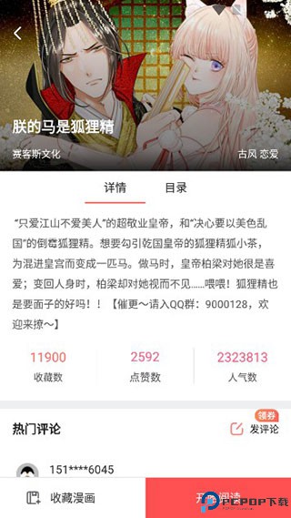 4、在漫画的详情页面可以看到大概剧情,以及收藏数、点赞数;