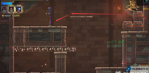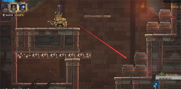 2、按下开关后,从平台左侧跳下,踩住魔法平台,然后再回到开关处。刚才踩下开关时,平台右边的石头已经消失了,直接跳下去就能打开宝箱。