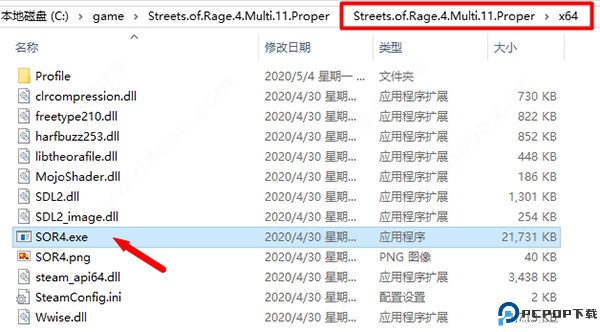 1、下载并解压游戏文件,在XStreets.of.Rage.4.Multi.11.Properx64文件夹中,执行SOR4.exe文件启动游戏;
