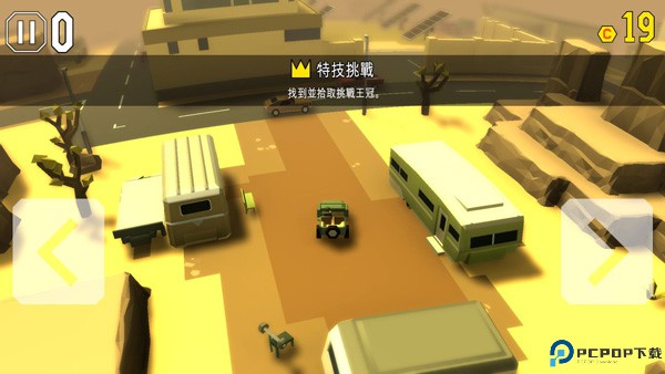 每辆车还有两个挑战,两个挑战不能同时完成,解锁第二个挑战则需要完成第一个挑战。挑战又有许多类型,比如生存一段时间,撞倒路灯,在濒死状态下生存一段时间,在空中滞留一段时间等。每完成一个便会在车辆的下方显示一个黄色的皇冠。当皇冠积累到一定的数量时,还会给予金币奖励。