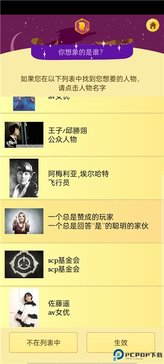 3、一共7个问题,当年回答完了,神灯将猜测你心目中所想的人物。