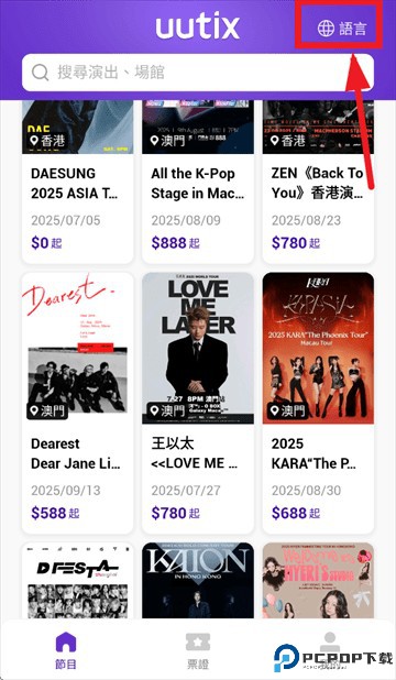 1、打开uutix app,进入节目首页后点击右上角语言按钮