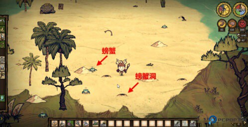 1、先来科普下饥荒里的螃蟹吧。其他版本饥荒是没有螃蟹这种生物的。螃蟹只会出现在沙滩上,也就是刚出生的那种淡黄色地形。