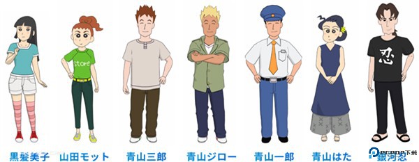 从左起分别是黑发美子、山田摩多、青山三郎、青山次郎、青山一郎、青山绮、银河忍。
