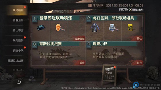 在主页面中,选择联动活动,进入联动活动详细页面,包括联动福利,青春法则,青山不言,联动签到,哥斯拉挑战赛。在联动福利,联动签到中可以直接领取奖励道具。在青春法则和青山不言页面可以选择参与活动获得奖励道具。