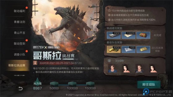 在哥斯拉挑战赛中组队在15分钟挑战成功可以获得奖励。战斗中耐久消耗和弹药补给消耗降低100%