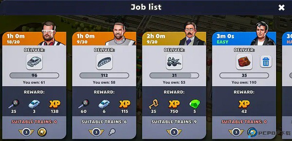 游戏为您提供任务,或者称之为“工作”。基本上你必须向他们提供一定数量的某种商品。没有时间限制,但有些工作需要某种类型的机车。您可以在上面的屏幕截图中看到,一些工作没有“合适的火车”,这意味着我没有任何合适类型的免费机车(史诗)。