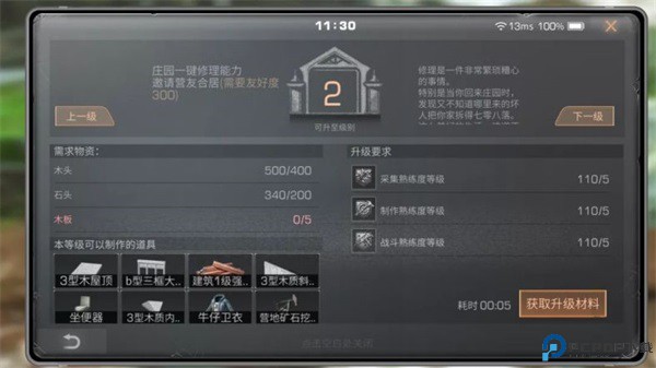庄园是末世最坚实的庇护所,庄园等级昭示着幸存者们的实力。首先升级庄园需要有足够的物资,以及相应的熟练度等级要求,升级所需物资可以通过采集和制作获取,亦可通过快乐101的交易摊位购买噢。