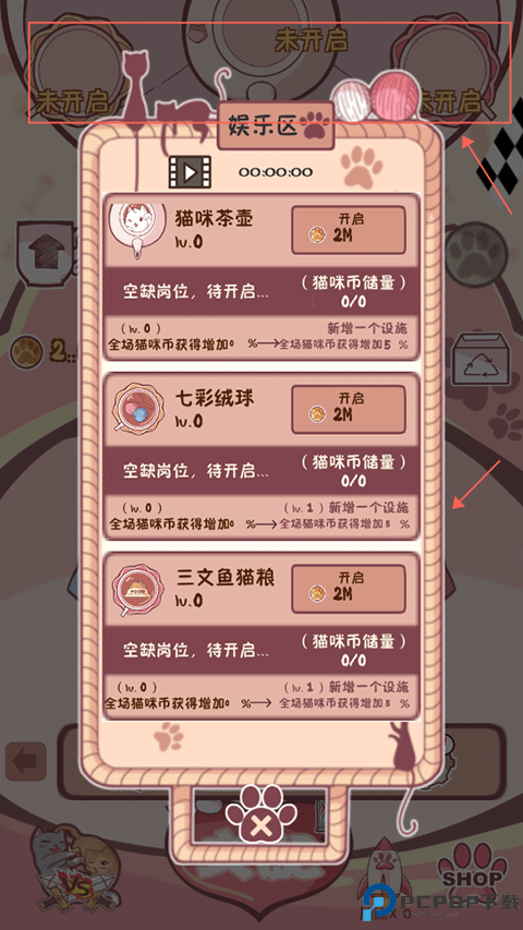 3、点击上方的“未开启”就来到了娱乐区,你可以使用金币开启猫咪茶壶、猫粮等等。