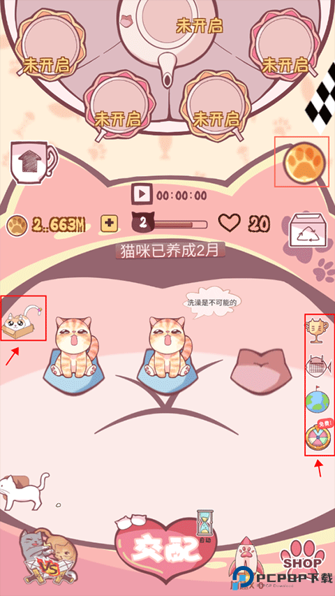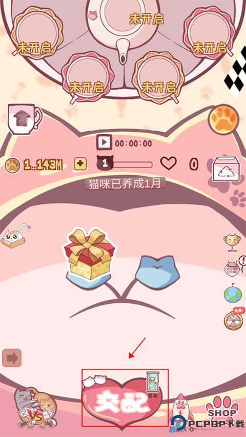 1、进入游戏后,点击下方的“交配”即可孕育出新的小猫咪。