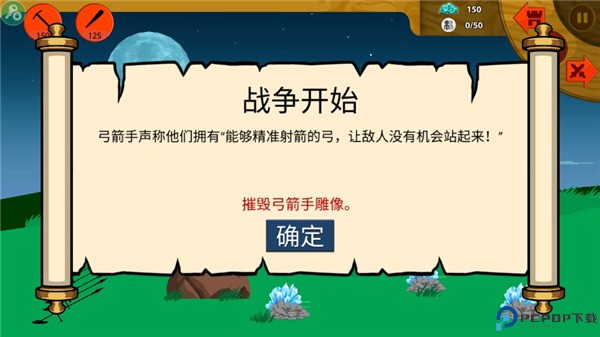 5、战争开始,弓箭手声称他们拥有“能够精准射箭的弓,让敌人没有机会站起来!”这里需要摧毁弓箭手雕像,点击确定;