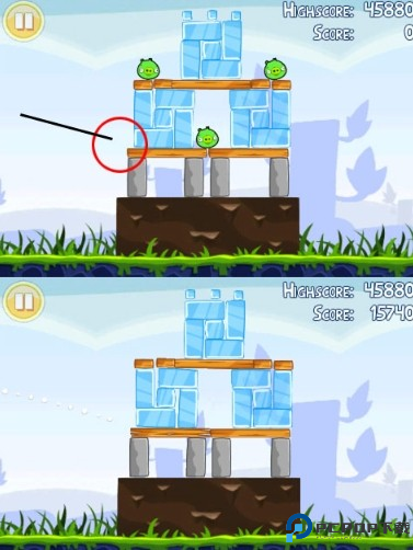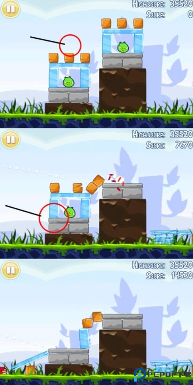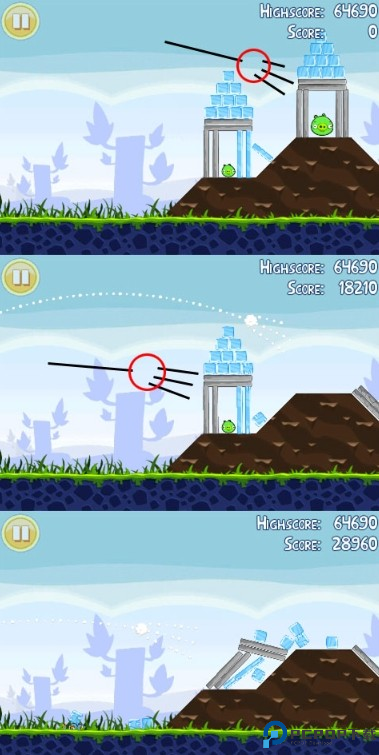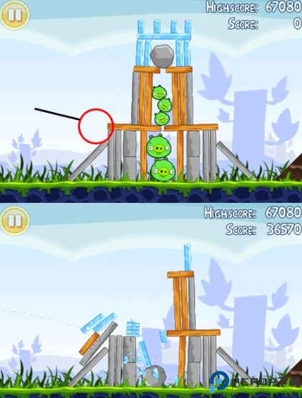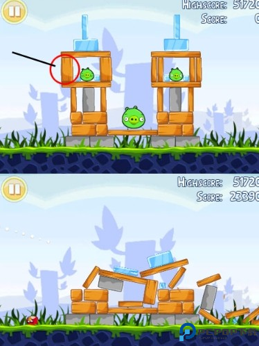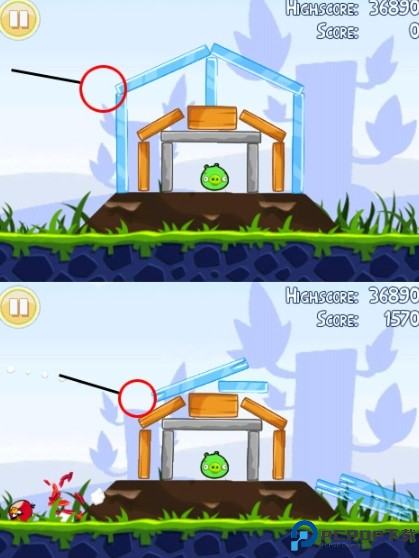 1-8:击中顶部的石块,小鸟会连带撞击其他目标,过关。