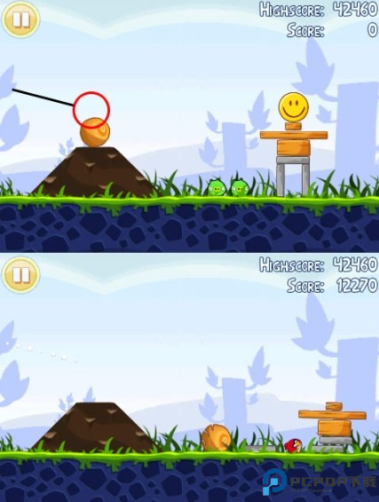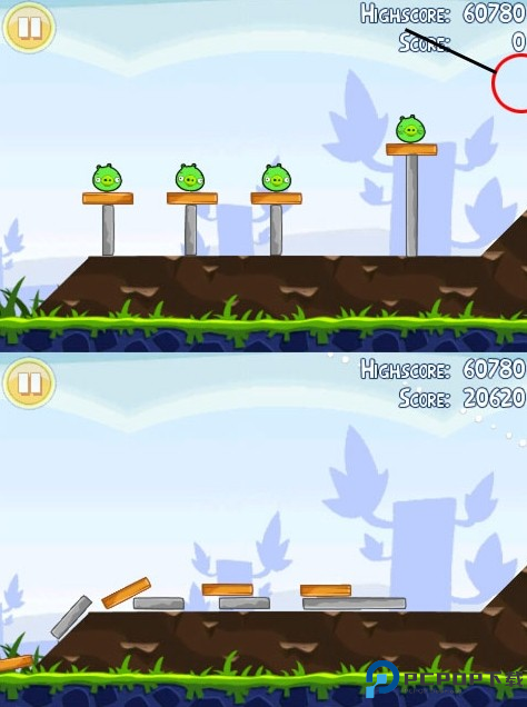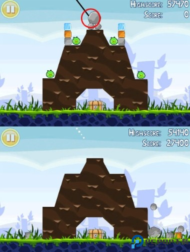 1-2:打向山坡上方,小鸟会滚下来,撞击目标完成关卡。