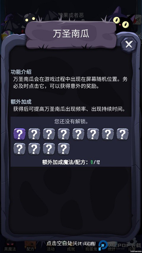1、在界面底部有黑魔法、配方、活动、成就、捣蛋鬼、统计以及设置,通过自动挂机的“战斗”,收集魔鬼糖浆,并在黑魔法中,升级魔法。