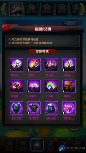 3、探险宝箱宝箱到底能获得什么呢?当然是好东西,看到图中一堆紫色极品装备是不是心动了呢,不仅如此还能获得随机的蓝及紫装、随机蓝及紫色宝物碎片、金色的法宝及变身器能源、还有蓝色品质的角色哦。如此丰厚的回报,让探险的乐趣再度升级。