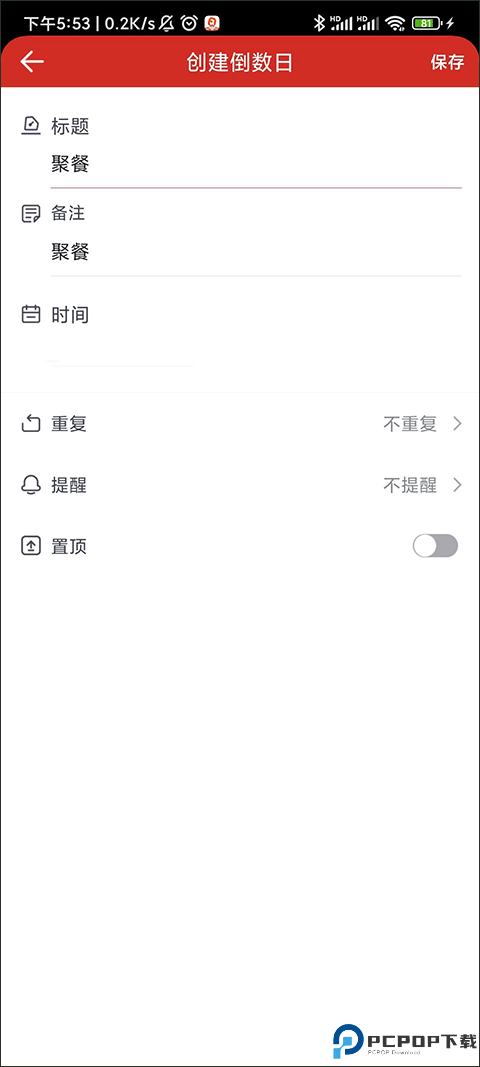 2、然后填写好标题、备注、时间,设置好重复次数、提醒和置顶后点击右上角的保存;