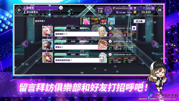 在「俱乐部」中玩家们还可以编制喜欢的曲目歌单分享给来自各地的DJ们一起MIX 演奏,拜访俱乐部按赞与留下心情小语和其他玩家一起切磋交流。