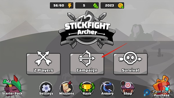 1、打开火柴人弓箭手,首页会显示三种玩法模式:左侧是无尽模式,中间是闯关挑战模式,右侧为多人线上模式。