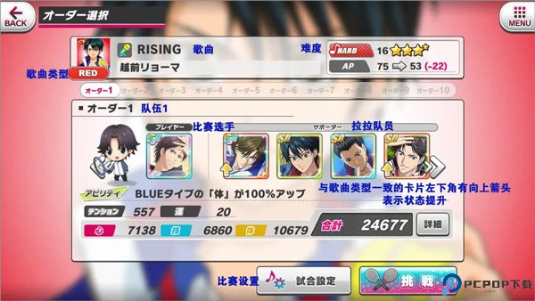 「心」、「技」、「体」体是每张卡牌的三项重要数值属性,三项属性之和即为卡牌的总属性值。队伍的总属性将会对比赛中的分数结果起到至关重要的作用!