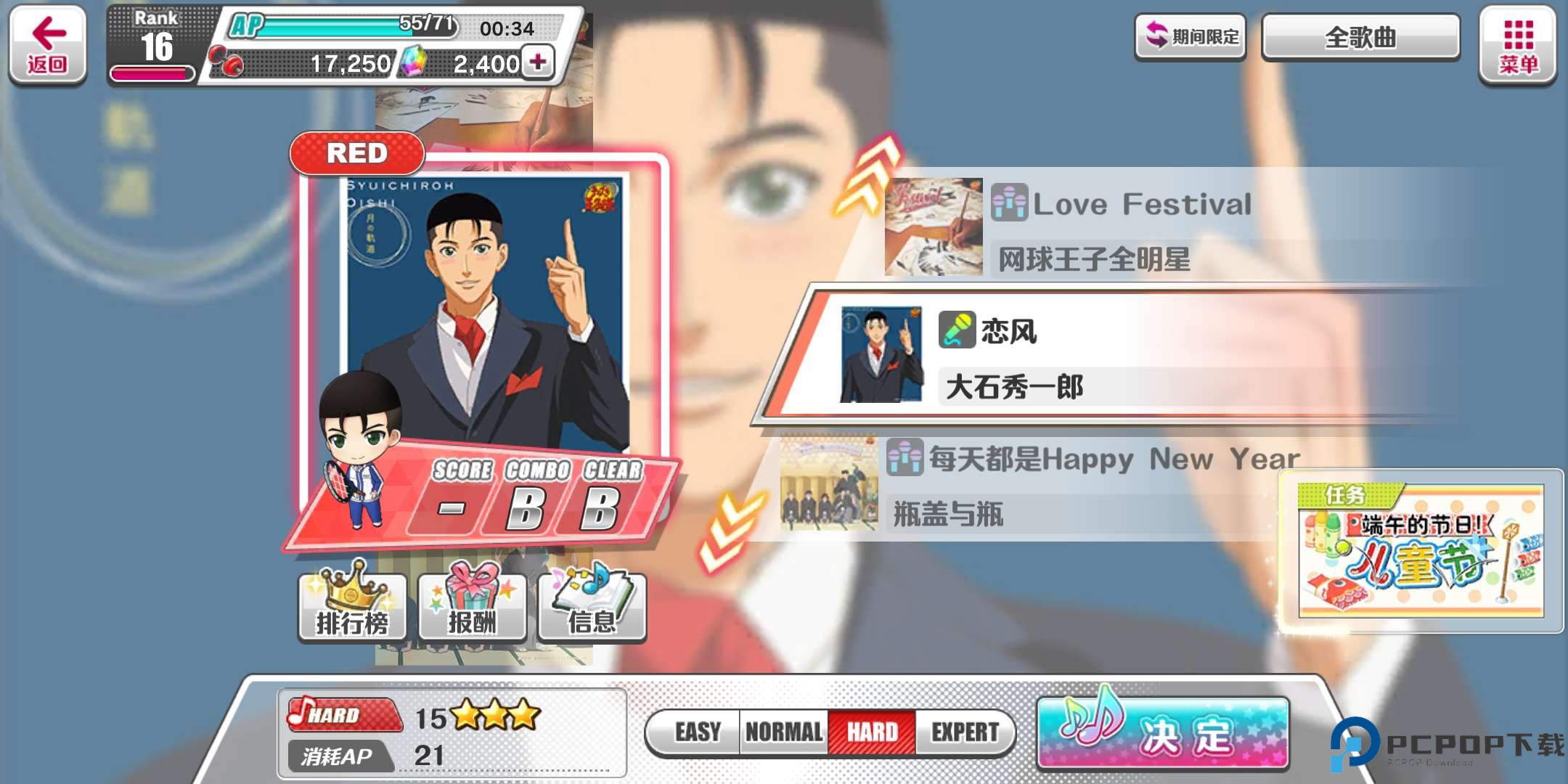 歌曲分为:通常,活动,期间限定,限定每月更换,本月即将结束,大家记得把大石的《恋风》通关哦。其次,尝试ex时如果没有把握可以组一队生命恢复的卡保命,因为这个游戏无法通关会扣体力还没有奖励,很不划算的
