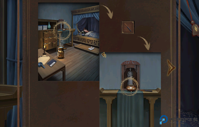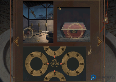 28、使用谷粉喂食马匹,马低下头的时候查看墙壁上的线索,点击场景左边墙根得木箱,如图所示根据马匹背后墙上图案调整转盘,打开木箱。