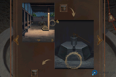 29、从箱子中获得道具铜压杆和木制轮毂,来到压水台这里安装好铜压杆,将空木桶放置在压水台下方,点击压杆压出水装满木桶。