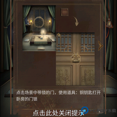 1、点击场景中带锁的门,使用道具: 铜钥匙打开卧房的门锁。
