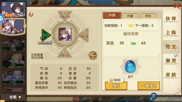 对每个角色所装备的符文进行强化升级、进阶升星也可以提升战力。
