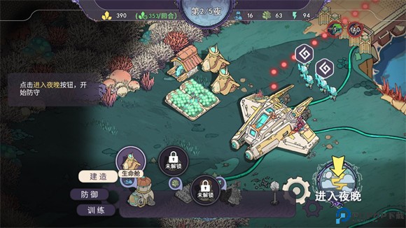 4、点击切换至夜晚模式后,将正式进入怪物进攻阶段,敌人会沿着路径袭来,玩家需凭借白天部署的建筑与部队进行抵挡。