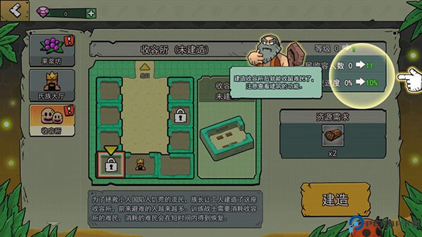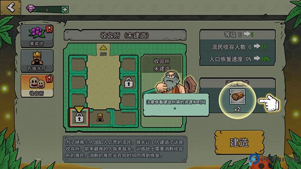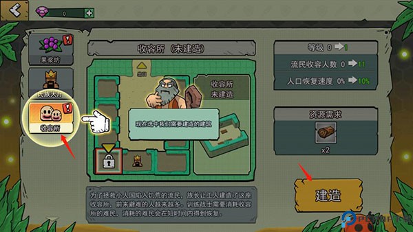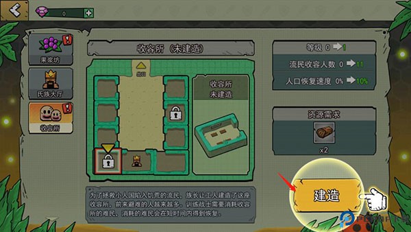 建造完后的收容所会自动吸引一些饥饿的灾民,现在开始建造一个果浆坊来为他们补充能量。