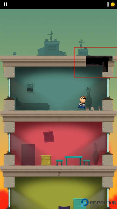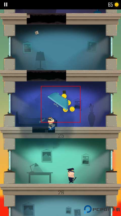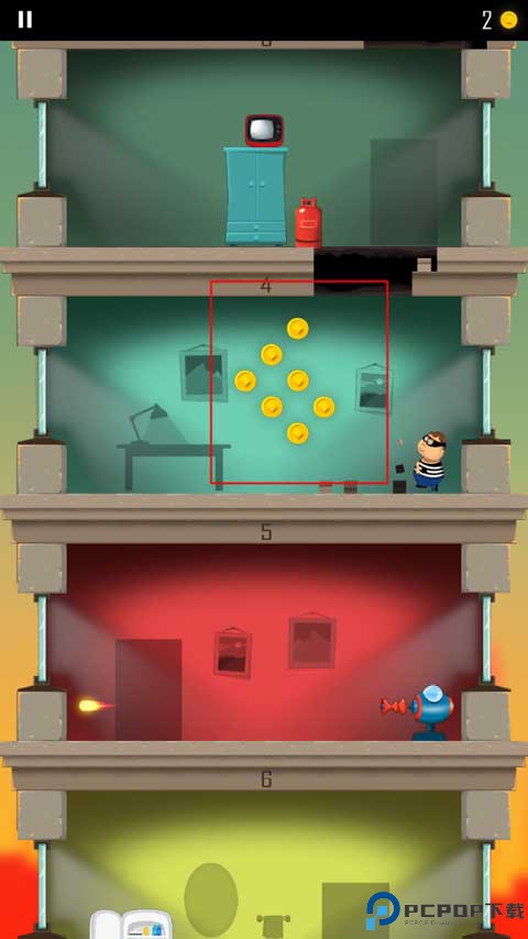 1、游戏开始会有一个小偷开始跑到另一层楼,玩家需要做的就是通过角色屁股着地的方式破开楼层,这样就能不断到达底下那一层了。