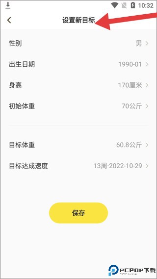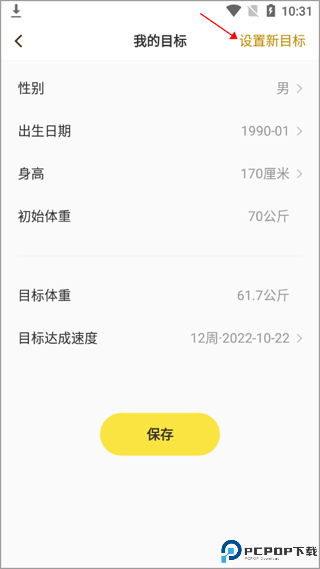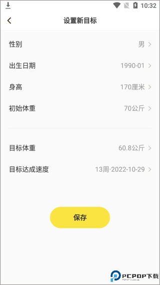3、设置新目标页面,延续简洁布局,性别、生日等信息可按需修改,目标体重、达成速度支持重新设定,用户依据当前身体状态、减肥诉求,灵活调整目标。