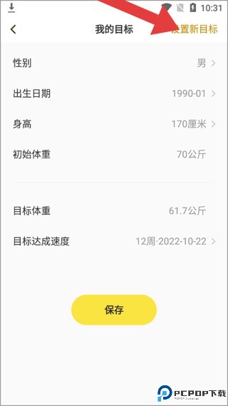 2、我的目标页面,可查看性别、生日等基础信息,以及初始体重、目标体重等数据,右上角设置新目标按钮,便于用户根据减肥进度、身体变化。