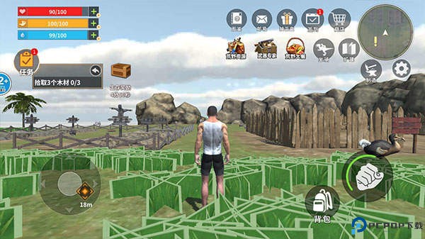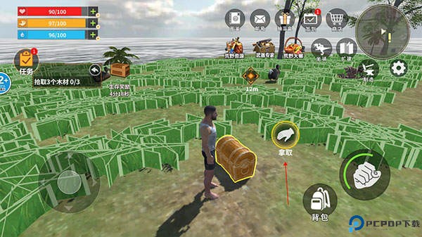 3、左上角的三个颜色条分别是生命值、饥饿值、水分,保持足够的数值才可以正常生存。