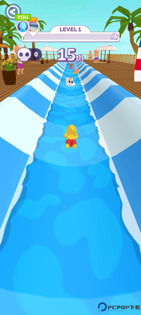 水上乐园滑梯竞速游戏里,玩家将和15位对手一同在水上乐园开启一场精彩的滑梯竞速,借助水流和赛道内遍布的道具可以更加方便玩家将对手甩至身后,从而更好地向冠军冲刺。划出赛道的玩家会受到延时惩罚但不会被淘汰,方便厚积薄发,来一次反超第一的逆袭之旅。游戏的操作方式十分简单,来回滑动屏幕即可操作角色左右移动。