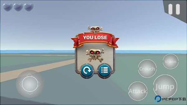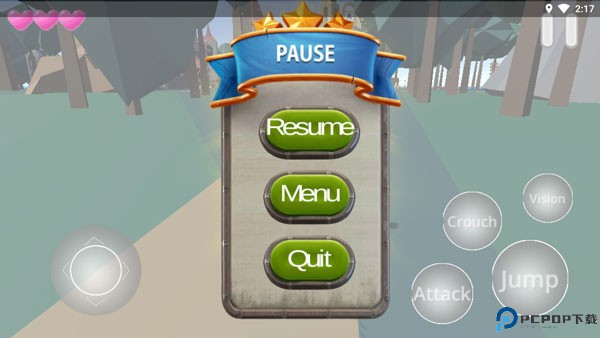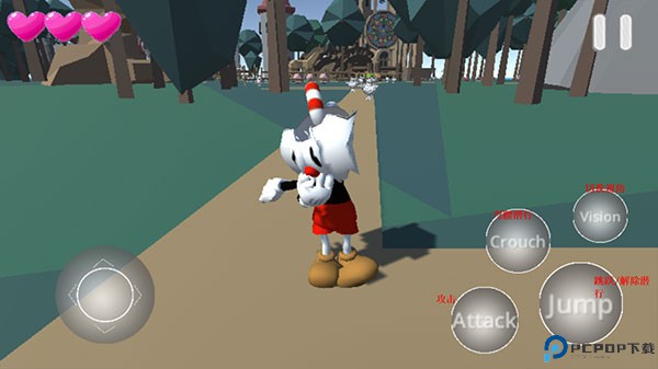 2、左下角按钮控制茶杯头自由移动,右侧分别是Crouch弯腰潜行,Vision切换视角,Attack进攻以及Jump跳跃等四个基本动作。
