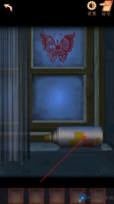 7、点击窗户,拉开窗帘(有小高能),获得【喷漆罐】(注意看窗户上的红色的蝴蝶剪纸)