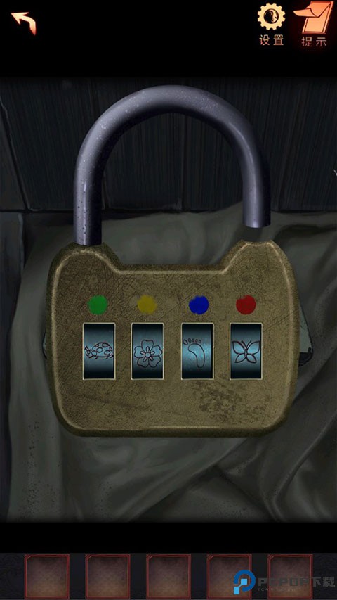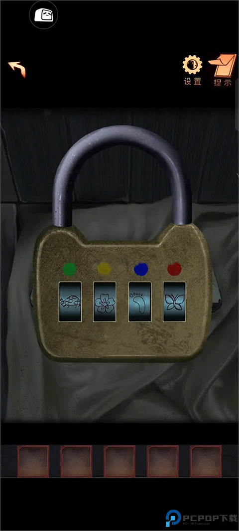 10、点击床上的文具盒,根据上面的颜色和挂历、窗户及镜子上的图案的颜色,调整盒子上的锁(绿色瓢虫、黄色、蓝色脚印、红色蝴蝶)