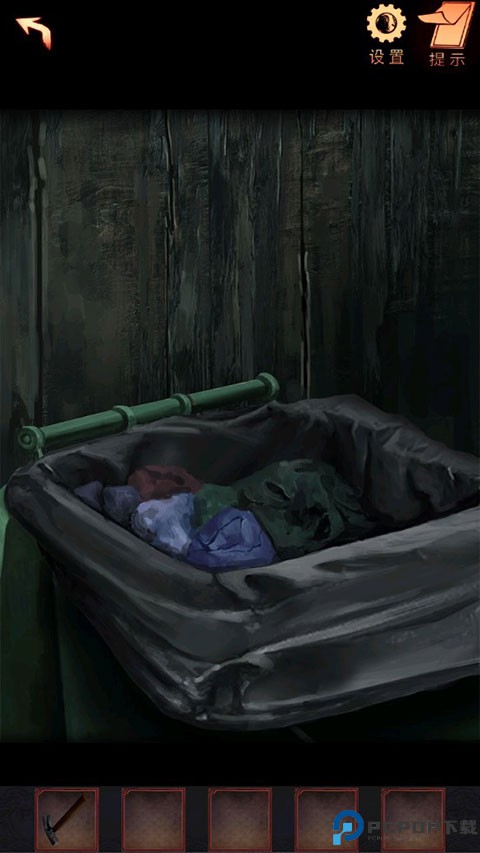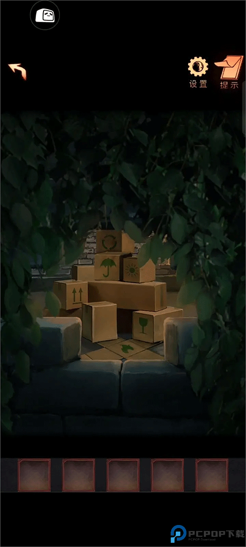 21、点击墙上的漏洞,查看院子里摆放的纸箱子上的图案的位置(有小高能)(火苗:1、酒杯:2、箭头:3、雨伞:4、太阳:4、循环符号:5)