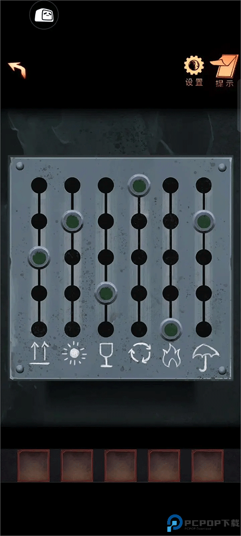 23、根据院子里摆放的纸箱子上的图案的位置调整机关上对应图案的滑块的位置(火苗:1、酒杯:2、箭头:3、雨伞:4、太阳:4、循环符号:5)