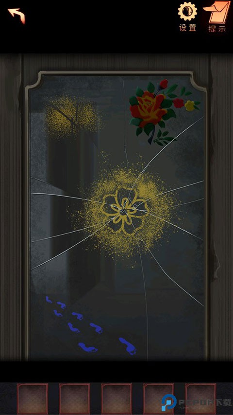 7、点击柜子上的镜子,使用喷漆罐,获得线索:黄色的花瓣和蓝色的脚印。