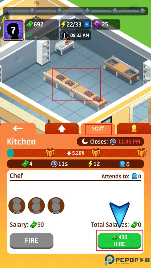 3、点击厨房的“工作人员”,花450现金聘请新厨师。
