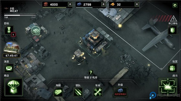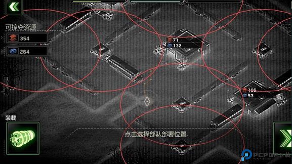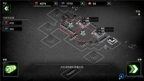 3、开始任务后,需要先设置部队部署位置,红圈内为高塔区,不能部署此处,建议观察可掠夺资源的周边建筑,计算每个障碍物的离资源点的距离,以及任务目标要求是什么,尽量完成目标以获取更多的资源,当然任务在前期都很好胜任,获得的宝箱可以开出5.56毫米机、MP5冲锋或是火炮等装备,以及等级经验,点击战队图标可查看全部武器以及设施,红色代表未获得。