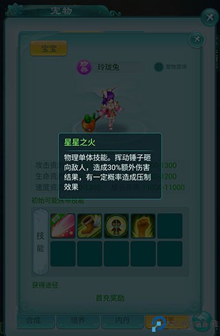 除了传统的宠物以外,还有一类宠物也是很推荐萌新带的,那就是珍兽。目前游戏中能够获得的珍兽大概就是充值礼包里的玲珑兔了,随便充点值就立即送给你,简直soeasy!玲珑兔的特点在于她的特殊技能“星星之火”,不仅伤害高还可以压制敌人,长得又超级萌,反正瑶瑶是喜欢得不行~