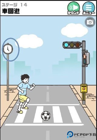 第十四关,等小明走到马路中间,点一下左边杆子上的时钟使用时间暂停,真的是时间暂停,在点一下右边红绿灯杆下面的黄色的开关,等红灯了在点时钟就过关了!!