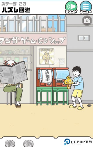 第二十三关,右边贩卖机点三下,在把硬币拖到贩卖机上就过关啦!!注意不要被老大爷发现,老大爷看报纸的时候赶紧点吧!!
