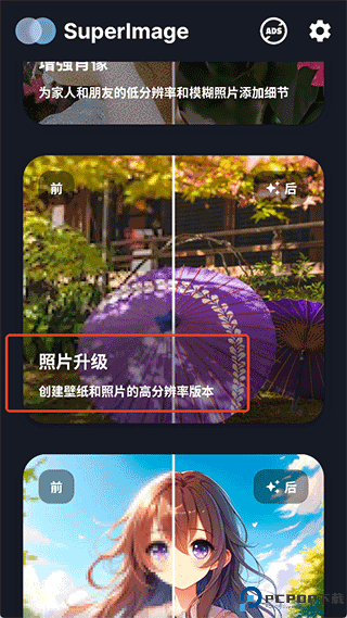 1、进入superimage中文版app后根据自己的需求选择对应的图片增强工具,例如这里选择照片升级