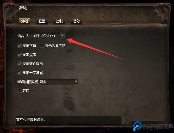 2、在选项中的第一页“游戏”页面中,找到语言,通过下拉菜单选择为simplified chinese(简体中文)即可成功设置。